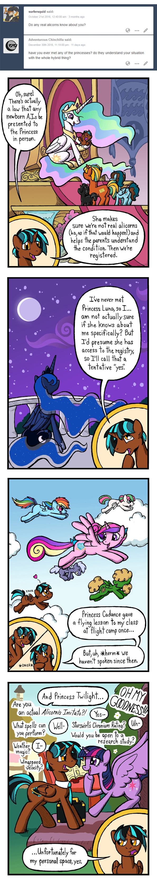 This comic is primarily reposts of my Tumblr pony ask blog (see above link). Please enjoy my pony OC dork and his family. :D