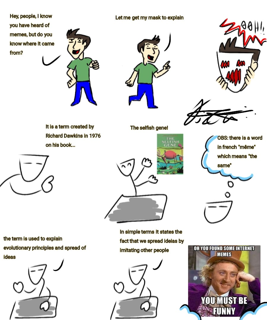 Well, it is a shallow explanation, so I recommend a research if you got interested. The sites which I researched: https://www.richarddawkins.net/2014/02/whats-in-a-meme/ http://www.wired.co.uk/article/richard-dawkins-memes https://www.fronteiras.com/artigos/evolucao-genes-memes-e-universalidade