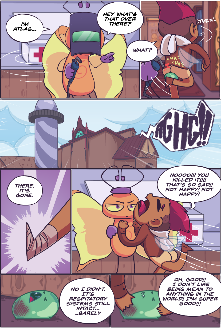 (Btw, your apostrophe is in the wrong place in the second-to-last panel. ^^;; "Its" shouldn't have an apostrophe, but "system's" should (assuming you were going for "system is" rather than "systems are", but something that small would only have one respiratory system, probably :p).)
