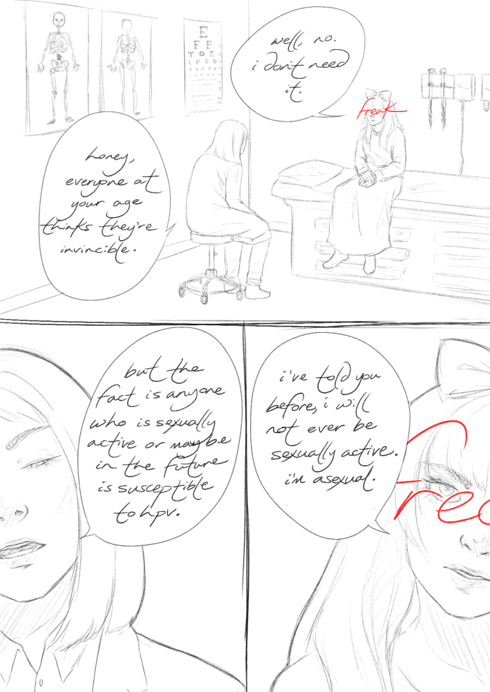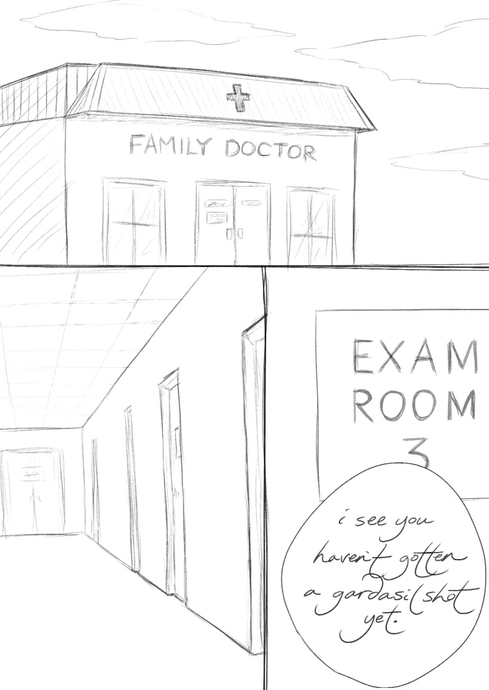2016 update: please note that this is chapter is not in ANY way saying to not get vaccinated! i so wish i had conveyed this chapter better, and it's my greatest regret in regards to this comic. the issue i wanted to convey was that my doctor was dismissive of me and told me that i was confused rather than discussing actual reasons why i should get vaccinated, such as if i had the horrific instance of being coerced/forced into sex, etc. vaccines are great!! please get vaccinated!!