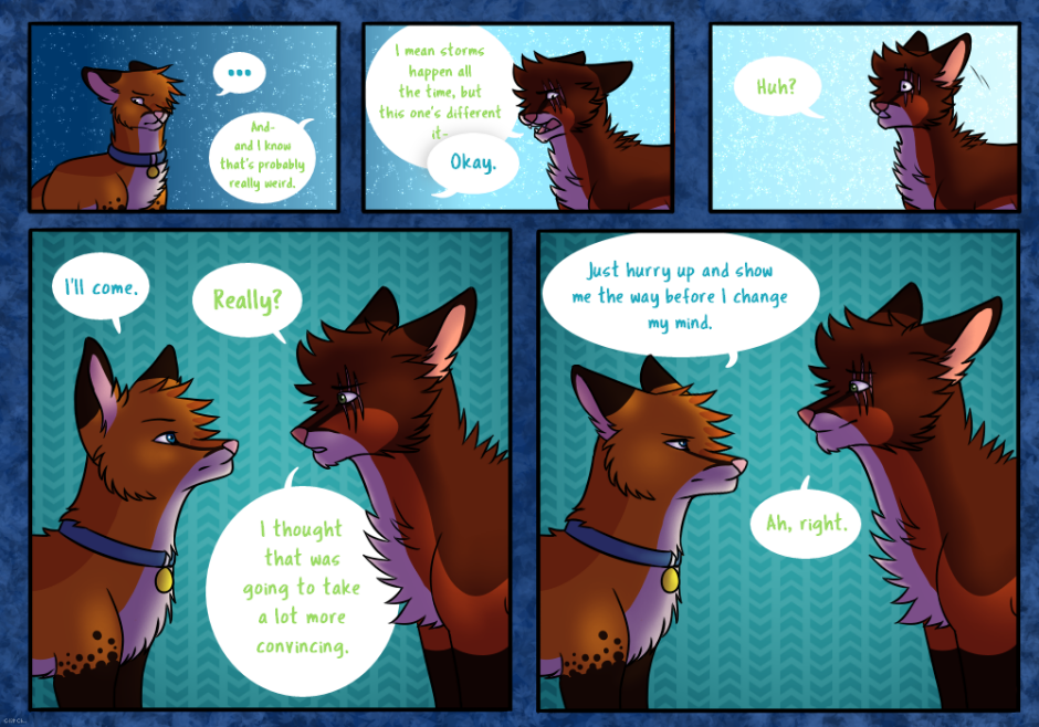 This comic follows the story of a young pet fox, kicked out of her home after her master mysteriously disappears. While seeking out her owner, she encounters new friends and enemies that all continuously mention a strange and cryptic 'storm'. The pressure on her only increases when they tell her that she must make a decision she knows nothing about. When balancing the search for her owner and her new responsibilities, she must spend her time wisely, for the sky will fall.