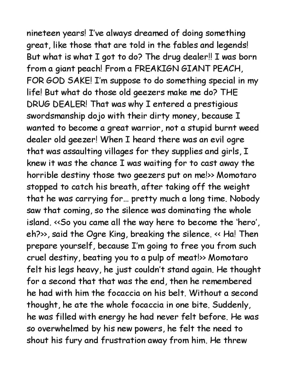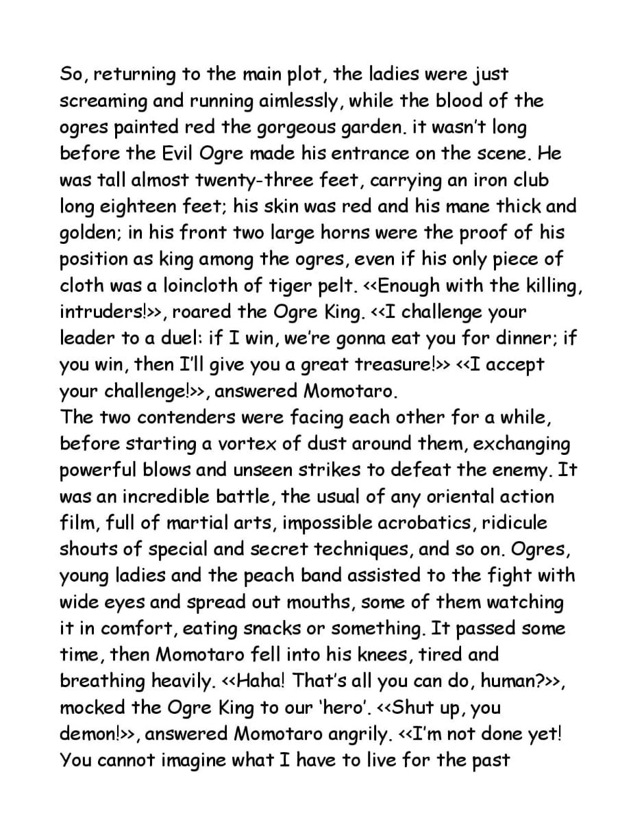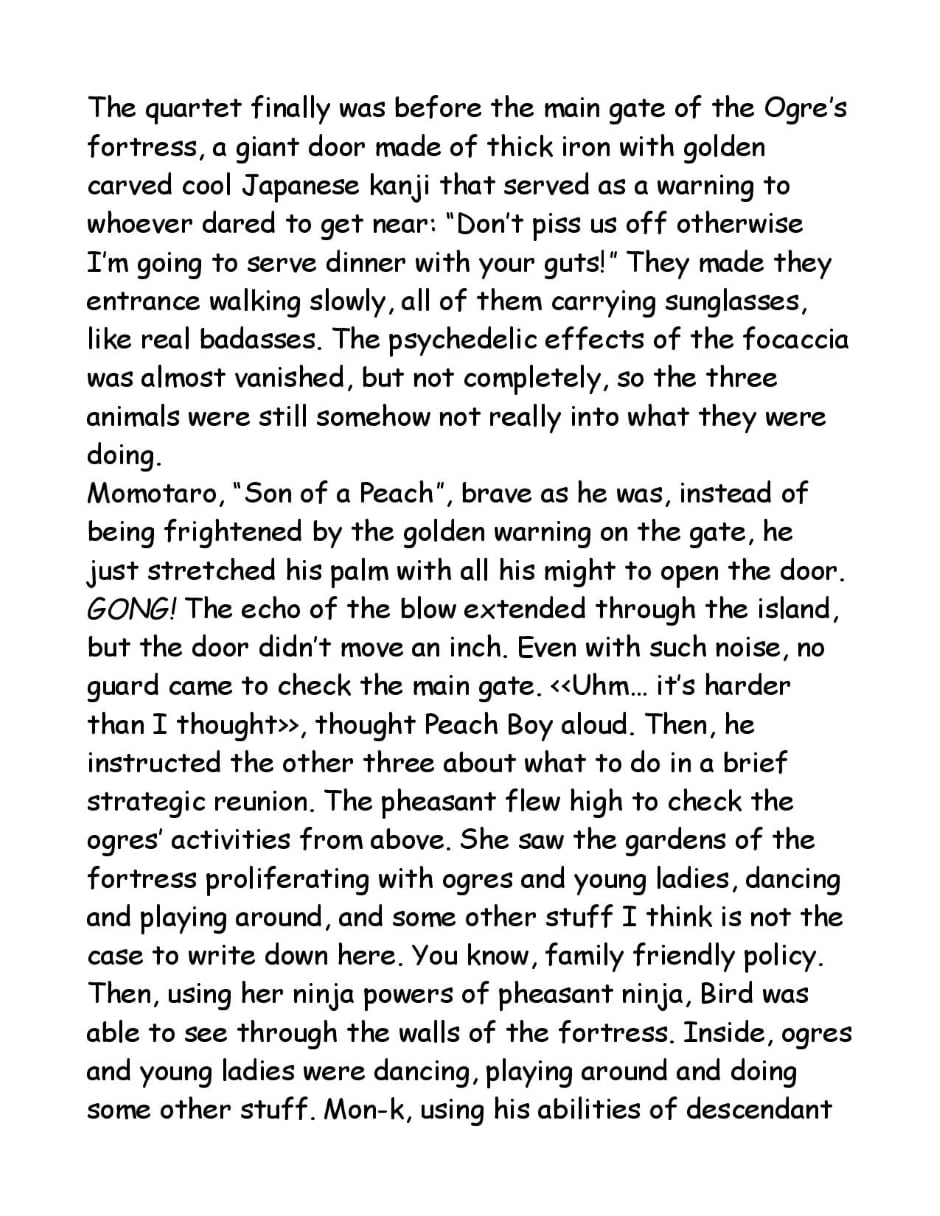 A short parody of the well known Momotaro Monogatari, in which the hero tries to be the hero, while everyone else is just messed up. More than a "comic", maybe this would be defined as an illustrated book. In the end, also the comic is not even being serious!