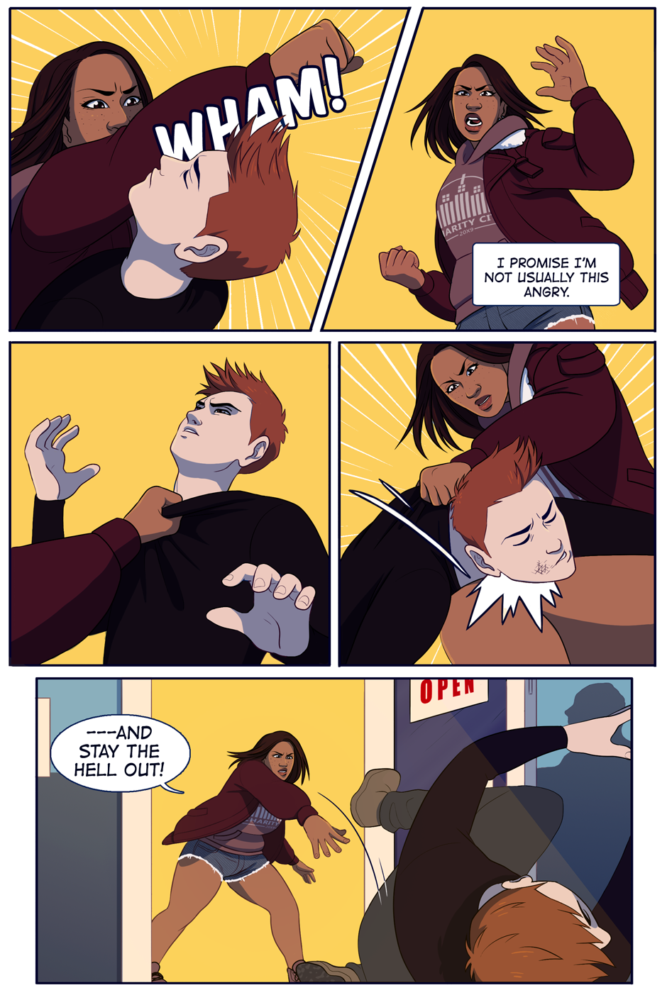 Let's start this off with a punch to the face. Page 01. Check Patreon for extra updates or to pledge and get the next page early.