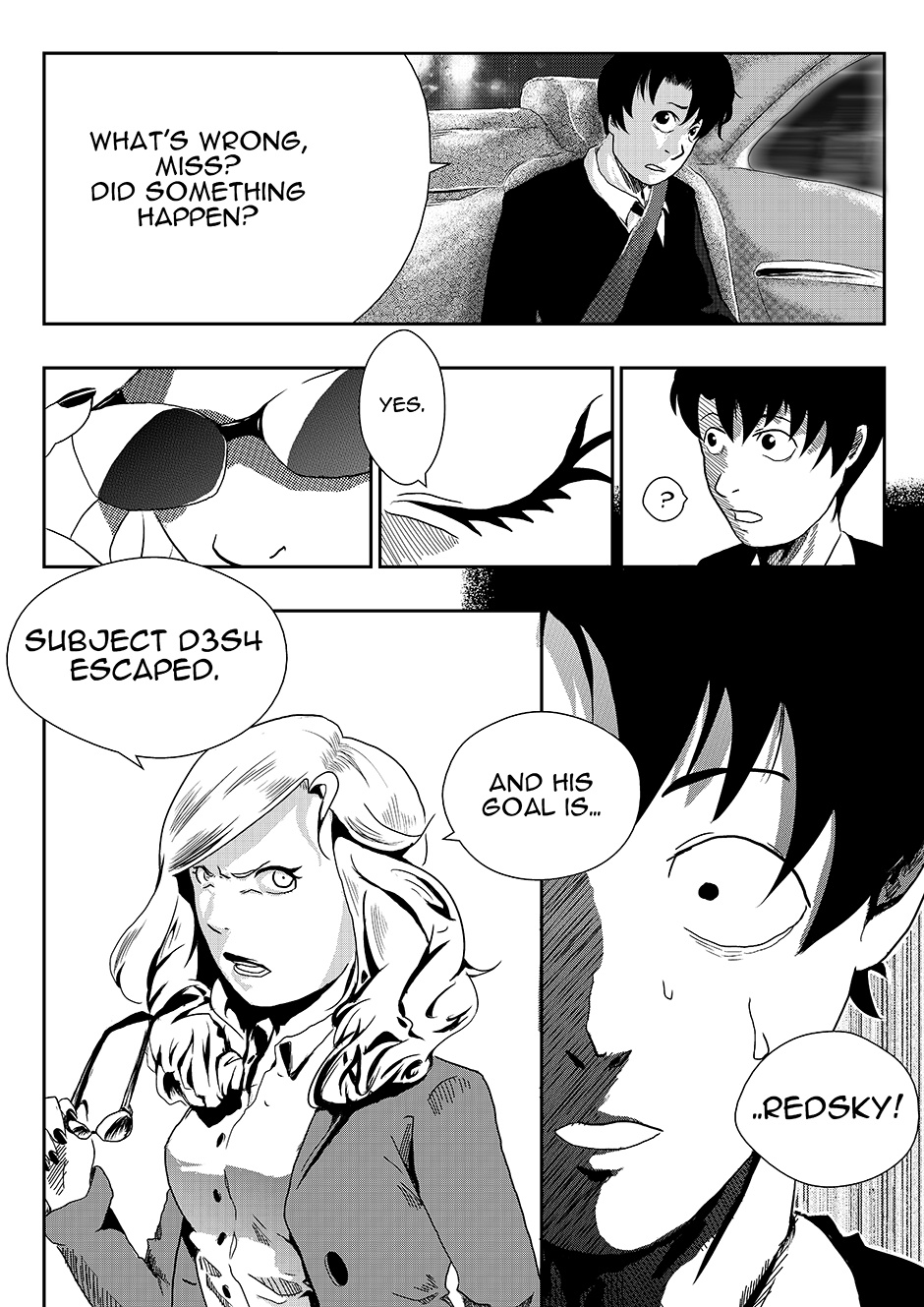 I how you showed that woman take off her sunglasses. The "Redsky" I wonder what that could be? The glasses seem somewhat small and the woman's head in frame 4 seems too big. To be off topic I did finish posting the last few pages of Seishin Pātonā. You can go to my page if you are interested.