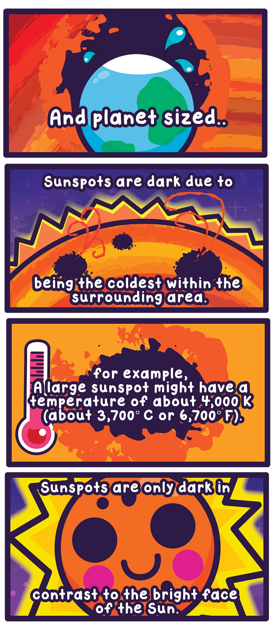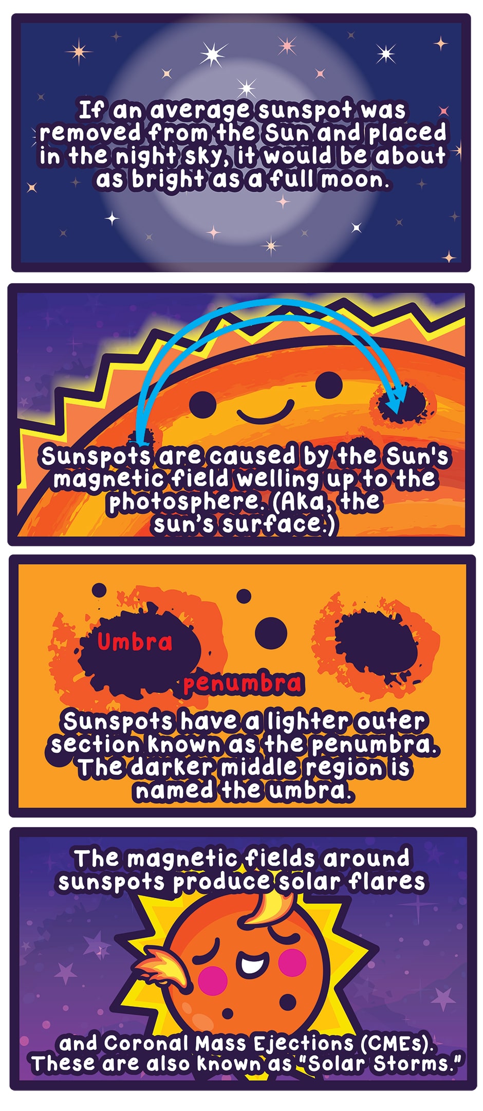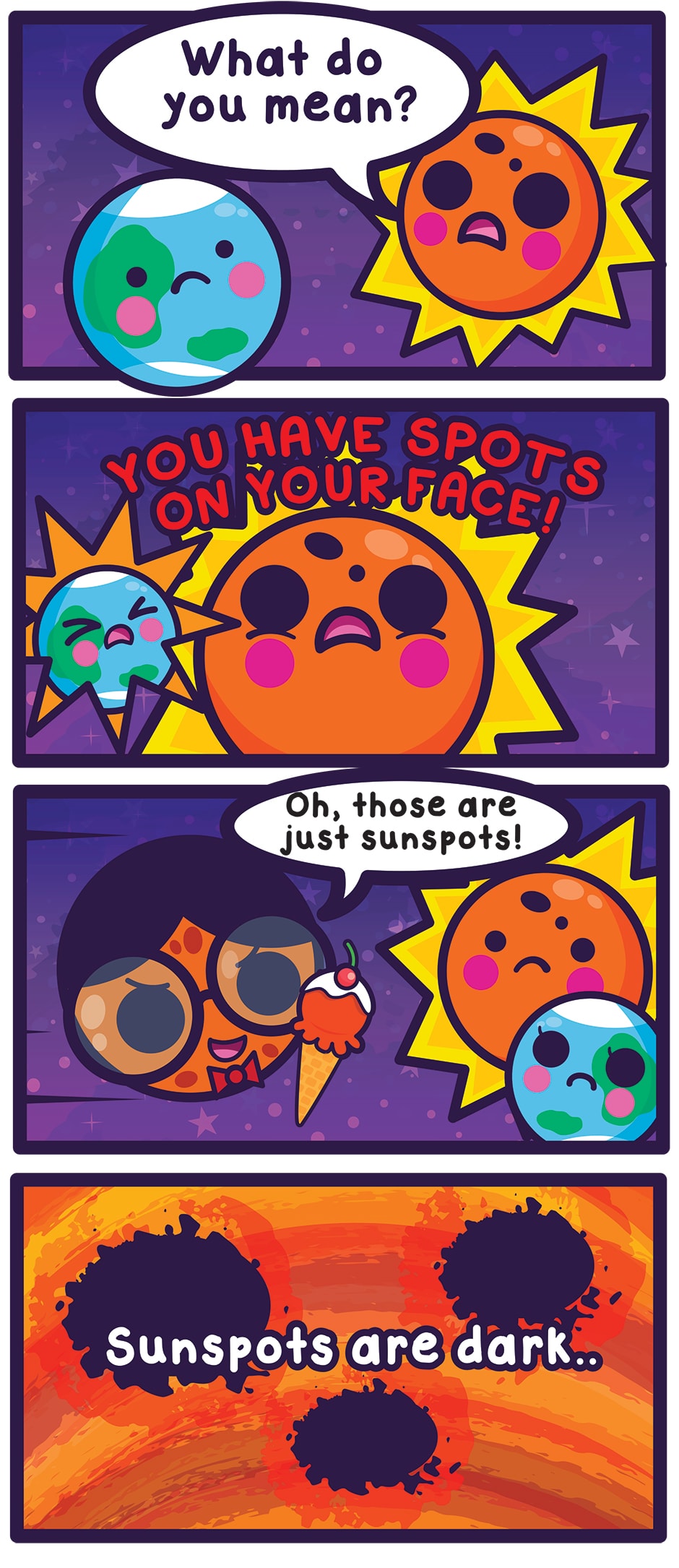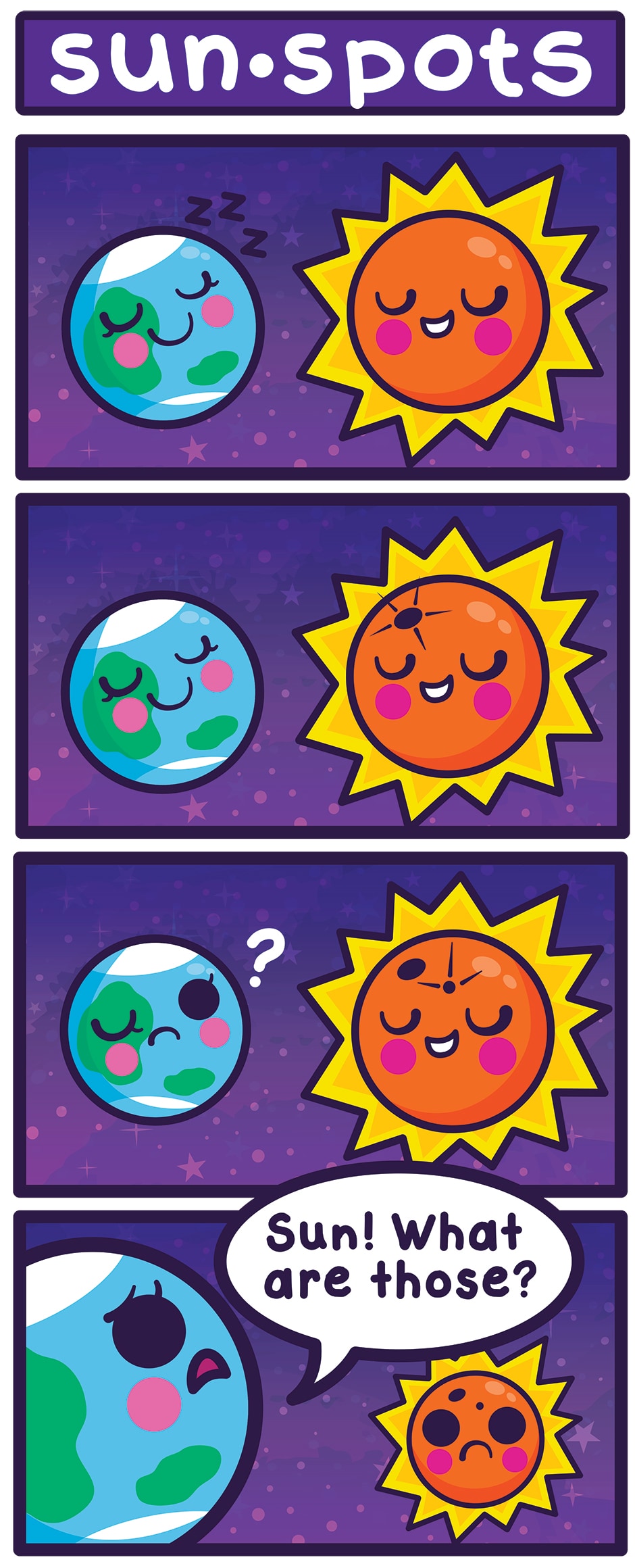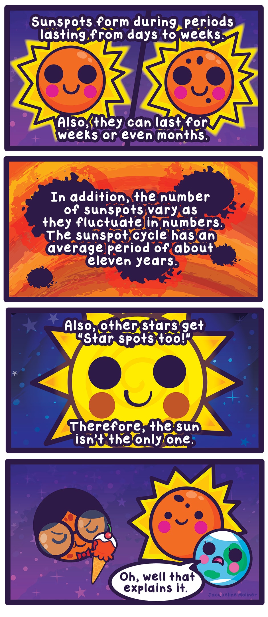 Starry Greetings! Here’s an early summer comic about Sun Spots! https://www.windows2universe.org/sun/atmosphere/sunspots.html https://www.space.com/14736-sunspots-sun-spots-explained.html