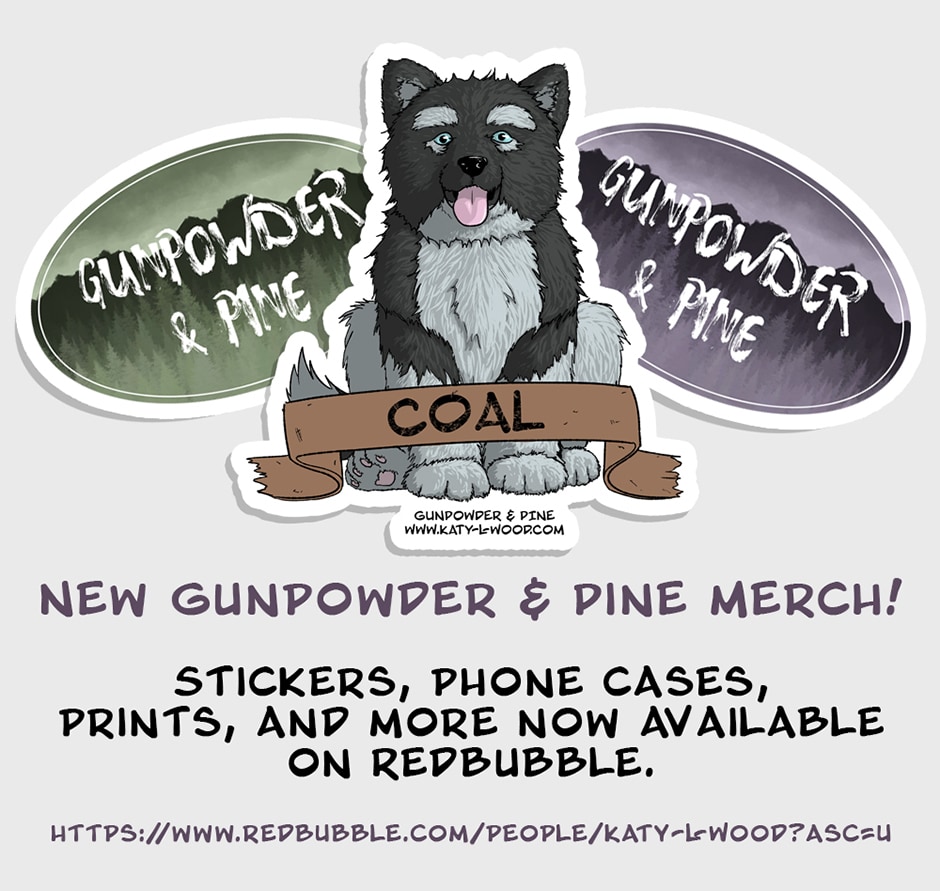 It's merch time! Thank you so much to everyone who has supported this comic so far. It means the world to me that you're all enjoying it. Now you can share your love of the comic with stickers, prints, and more. Shop everything G&P related on my redbubble! I know you all want a sticker of Coal. https://www.redbubble.com/people/katy-l-wood/collections/920475-gunpowder-and-pine?asc=u