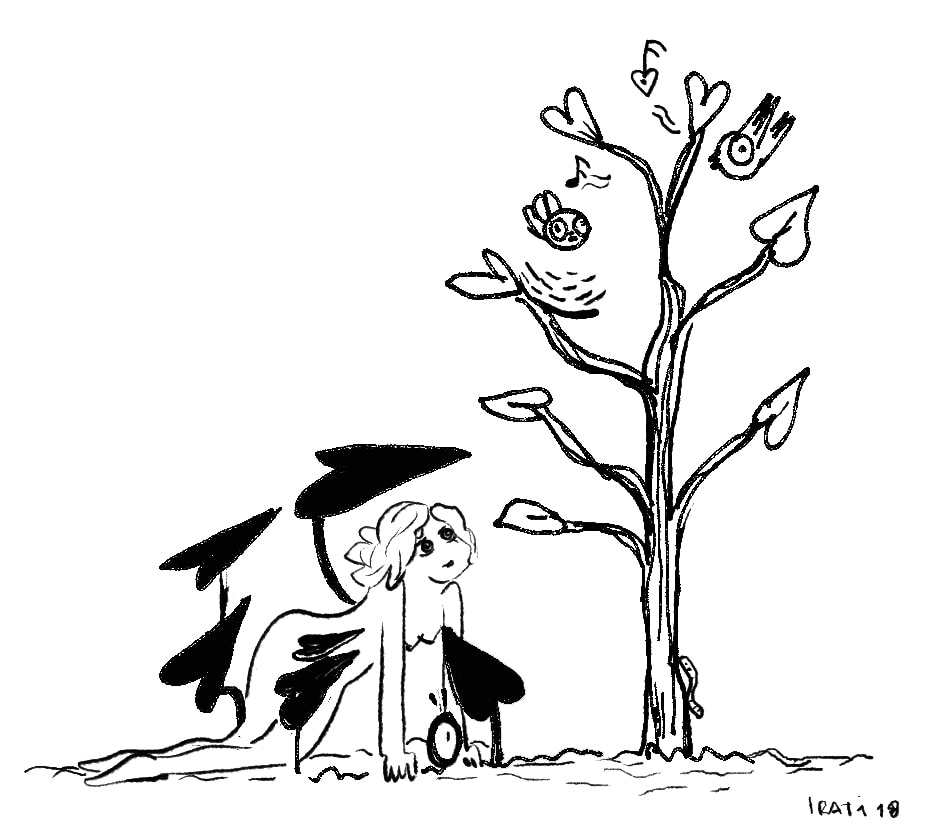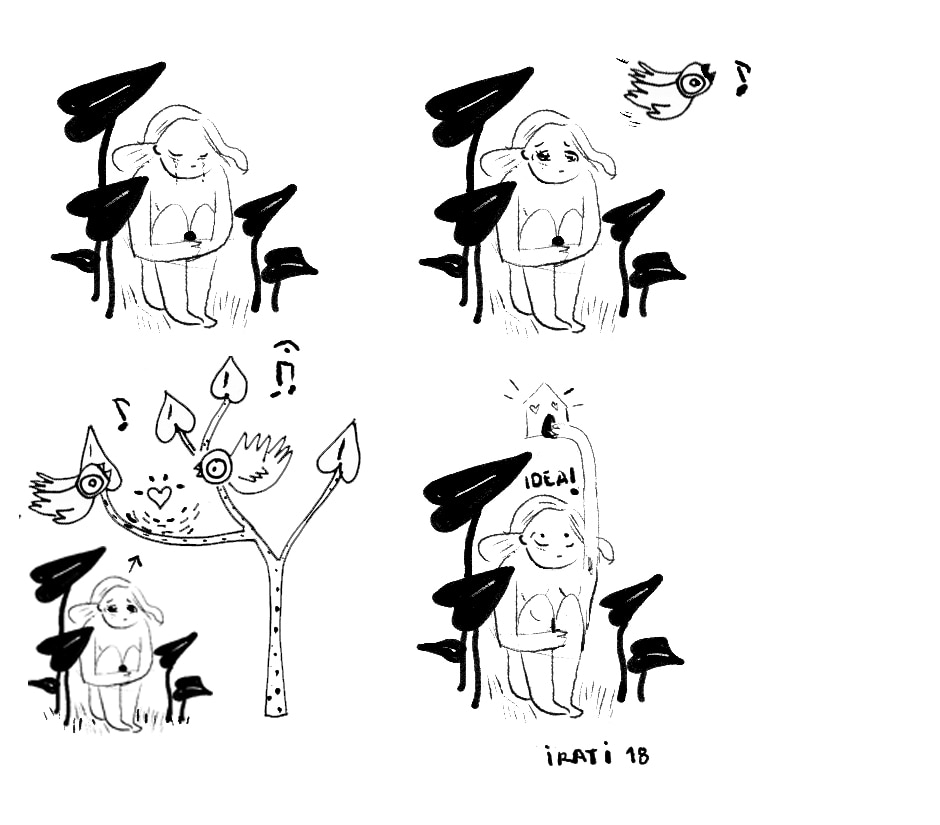 Crying and alone. Hided under a bush something takes her attention. Some birdies are singing. She watches them building that nest and a brilliant idea comes to her head.