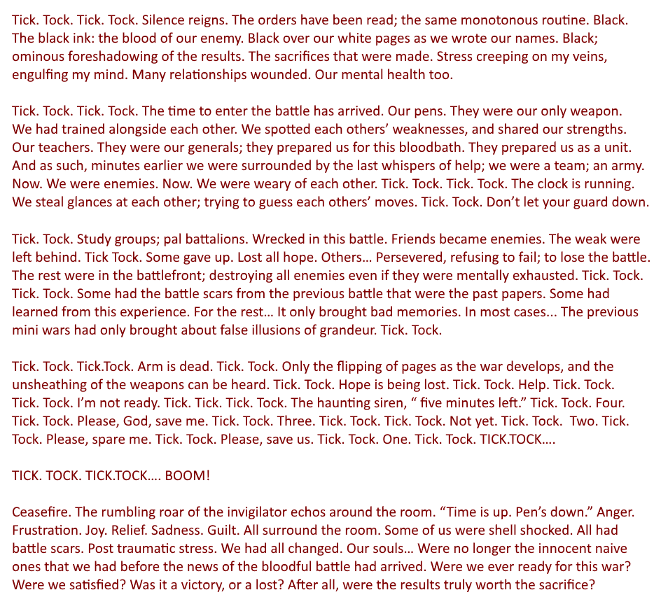 Exam season has just ended for most of us. For most it might feel like a battle, and a daunting time. This is a short story I have been wanting to write for quite some time, which describes a darker side to exams. I hope you may enjoy, and I would appreciate any feedback.