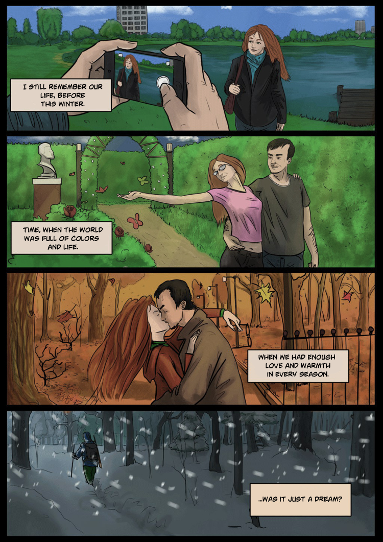 For the long time planet was covered in dark. Snow and ice chained it forever. Most of living creatures died, and those who survived began to envy the dead. Lonely survivors walk through the cold white wasteland in hope to find warm places.