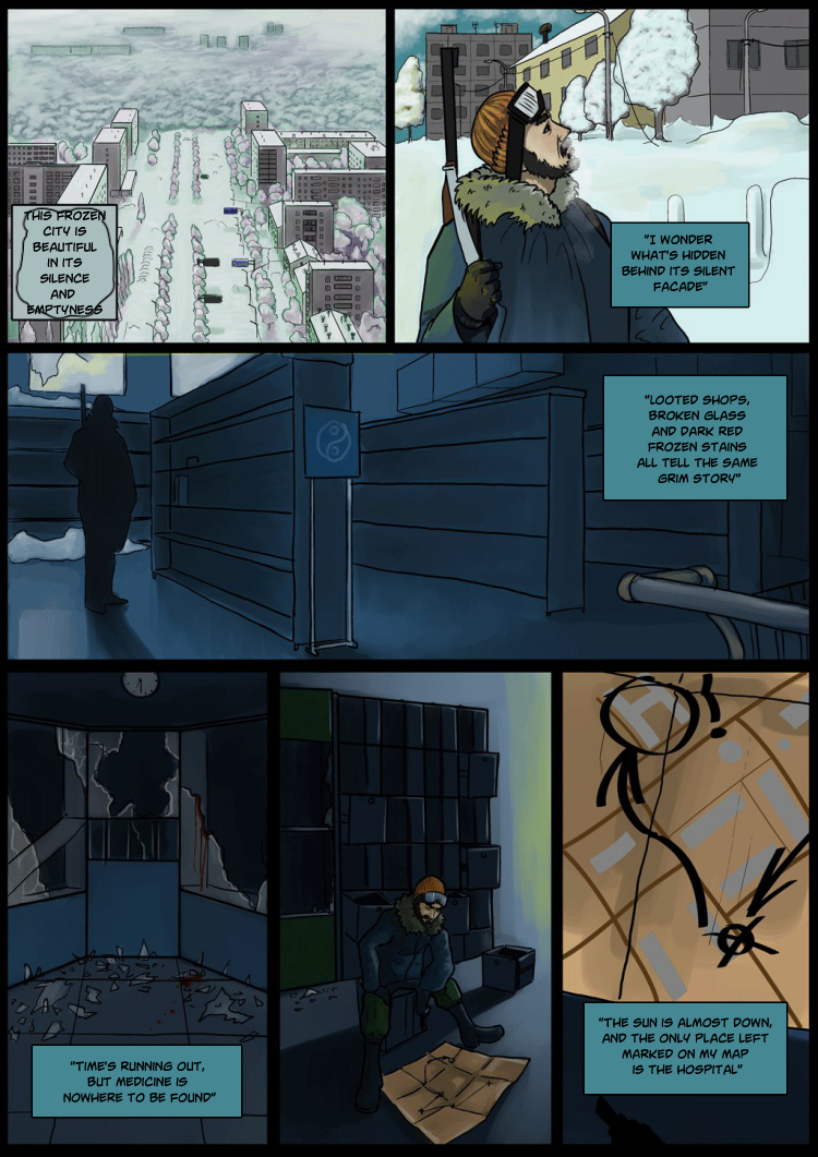 For the long time planet was covered in dark. Snow and ice chained it forever. Most of living creatures died, and those who survived began to envy the dead. Lonely survivors walk through the cold white wasteland in hope to find warm places.