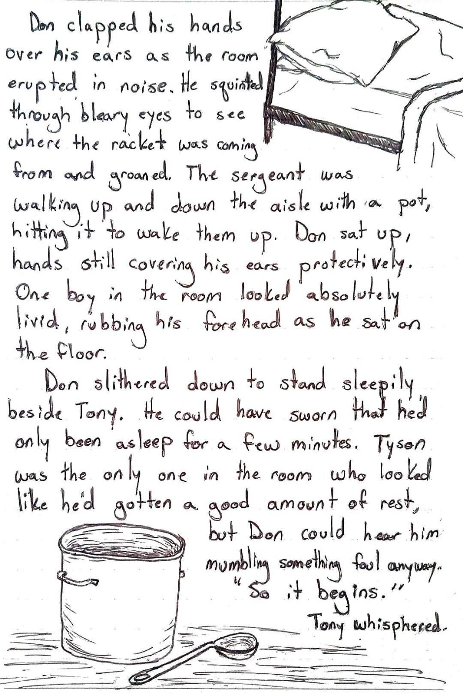 Don clapped his hands over his ears as the room erupted in noise. He squinted through bleary eyes to see where the racket was coming from and groaned. The sergeant was walking up and down the aisle with a pot, hitting it to wake them up. Don sat up, hands still covering his ears protectively. One boy looked absolutely livid, rubbing his forehead as he sat on the floor.