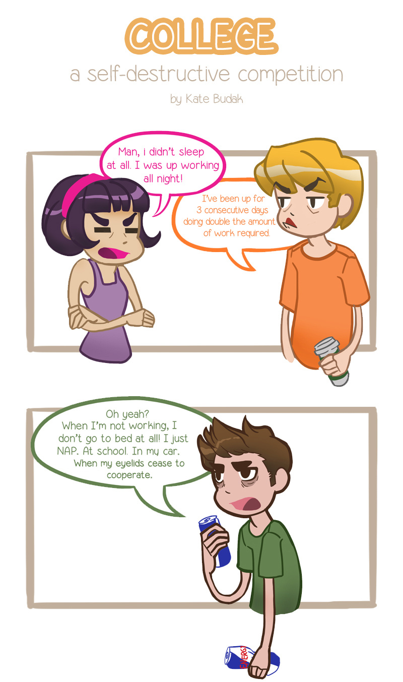 To clarify, I don't go to a conventional college. I'm enrolled at a very competitive art & design college. I'm assuming it happens other places as well- I've noticed this weird underlying tone of competition between people and how much they're willing to sacrifice their health, sleep and relationships for homework/projects. It's like a "if you're not suffering from a chronic fatigue while in term, then you're not working hard enough!" kind of attitude. You always feel like you're not being productive enough. PLEASE, everyone, you must prioritize your health first. I know I'm a hypocrite about this, but its good advice.