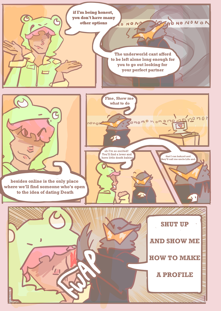 Dating has never been easy, and Death himself has also had some problems. From freaking out the date, to sacrificing them, or just in general... ruining their life. Join Life as he searches the internet for the perfect mortal companion for his best buddy Death.