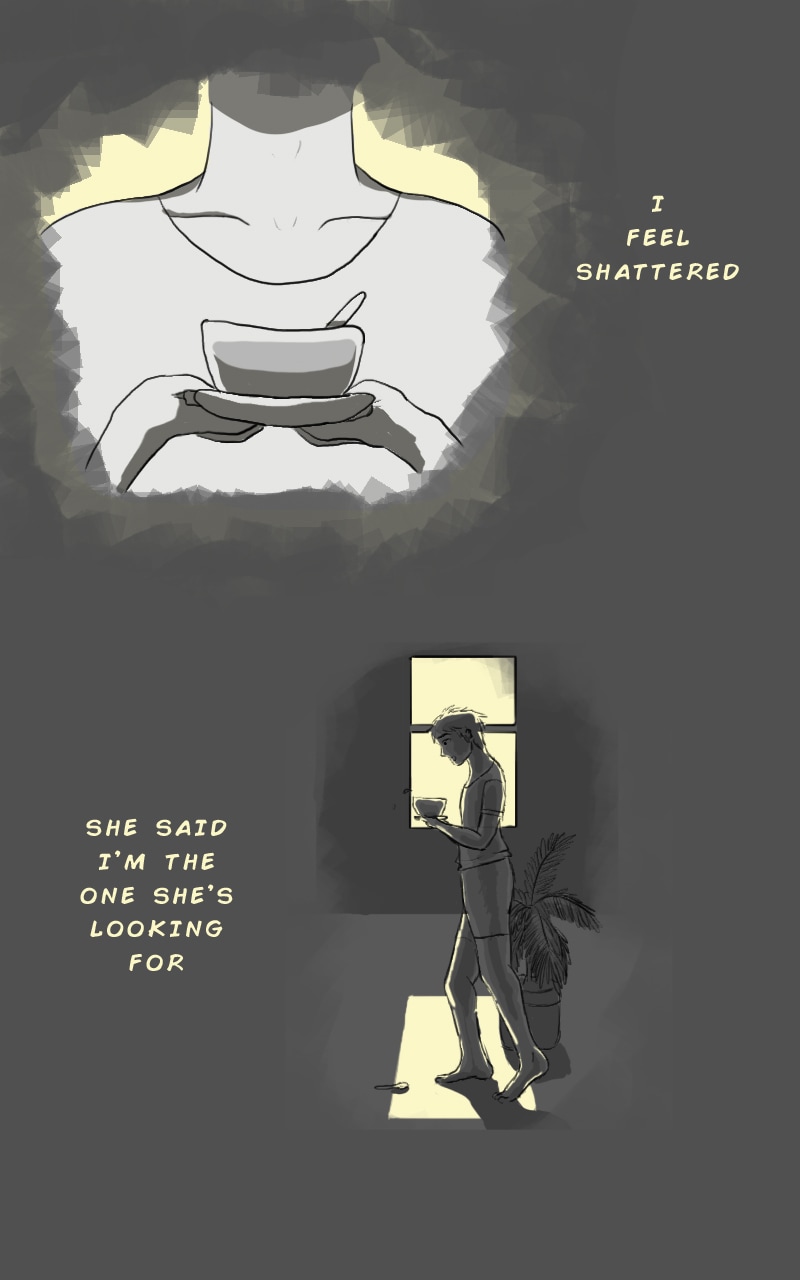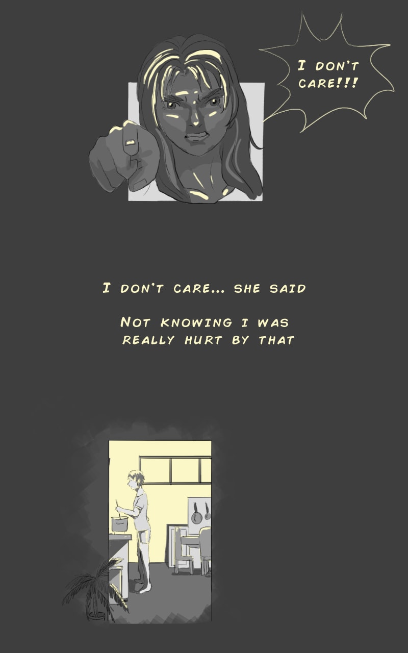 I don't care: the story of an apathetic bitch and a loving man. Apathy and Empathy are both blessings and curses. Grayscale and yellow light experiment :)