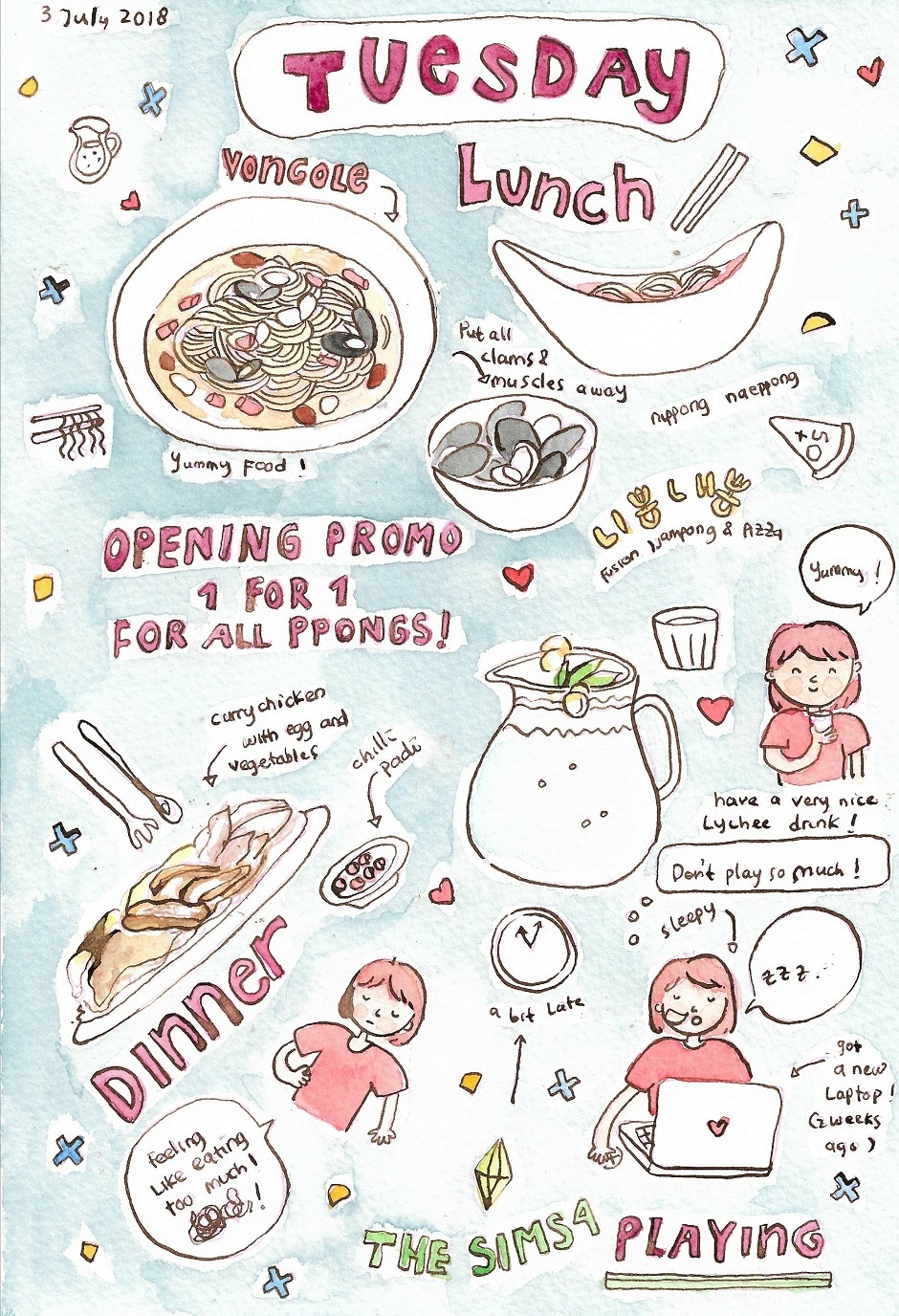 I ate a nice vongole pasta, a nice lychee drink, and sinful fried chicken chop with curry
