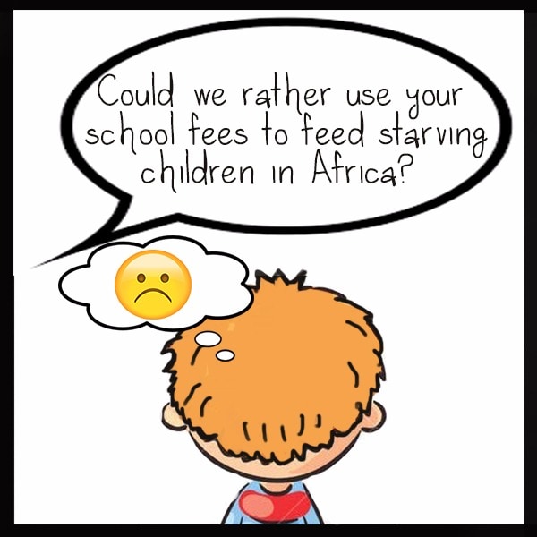 We used to say "Finish your food, There're starving kids in Africa that would appreciate it". Apparently the wrong answer to tell you mother is "Well give it to them!". My teacher always thought of others first.