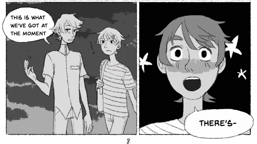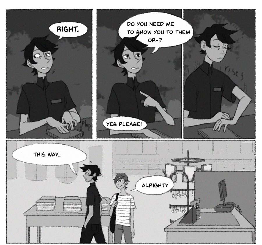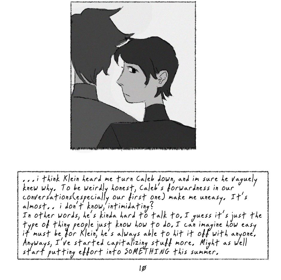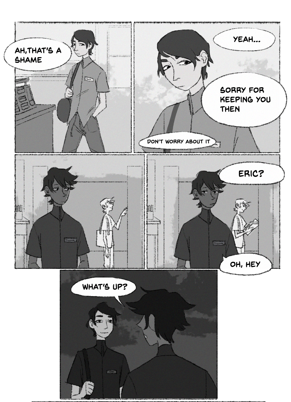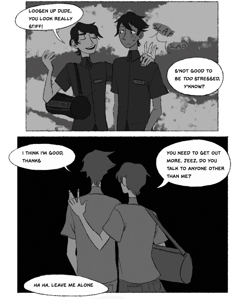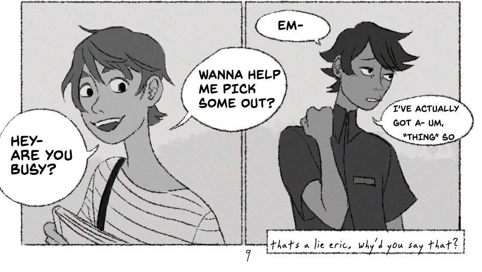 HAHA im aware the update is 3 days late.... idk man,,, life. anyways eric's a preeeetty nervous kid and hasn't figured out how quite to cope. poor kid. also.. how does the comic read? i feel like the transitions and interactions are awkward but maybe it's just cause i look at this shit for hours on end
