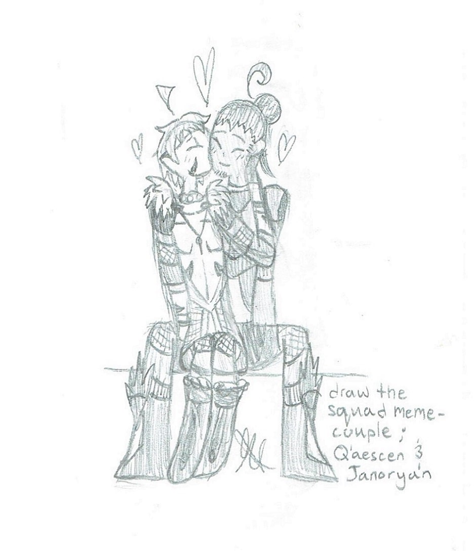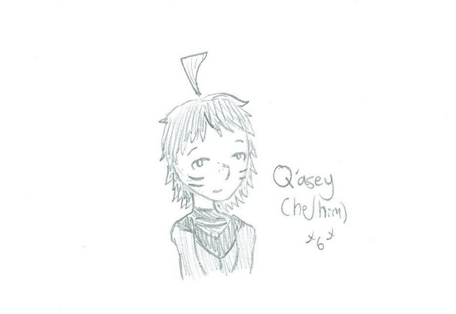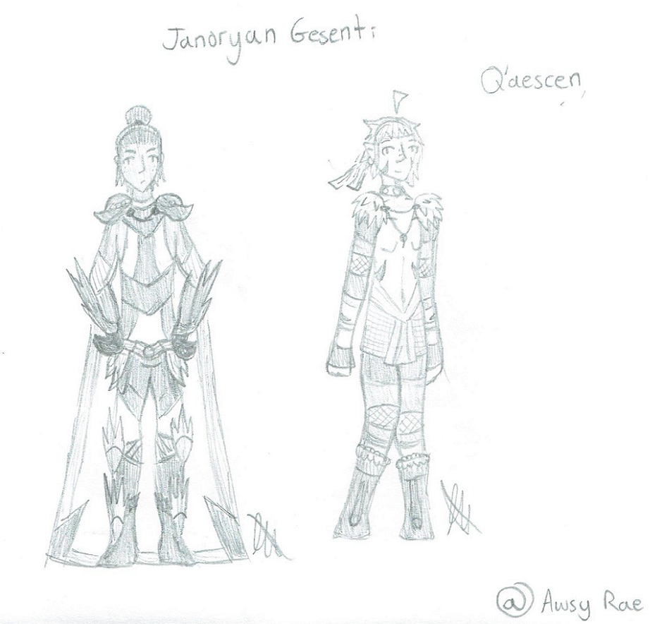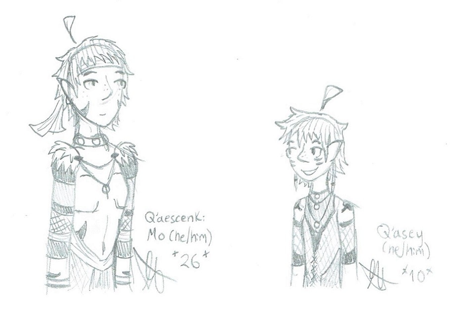 These are some sketches of two (gay) characters! The tribal prince Q'aescenki Mo, aka Q'aescen/Q'asey. And the traveling do-gooder Janoryan Gesenti, aka Jan. They are both dorks and I love them! <3 (also Jan is bi, Q'asey is pan) he/him for both the characters here! :)