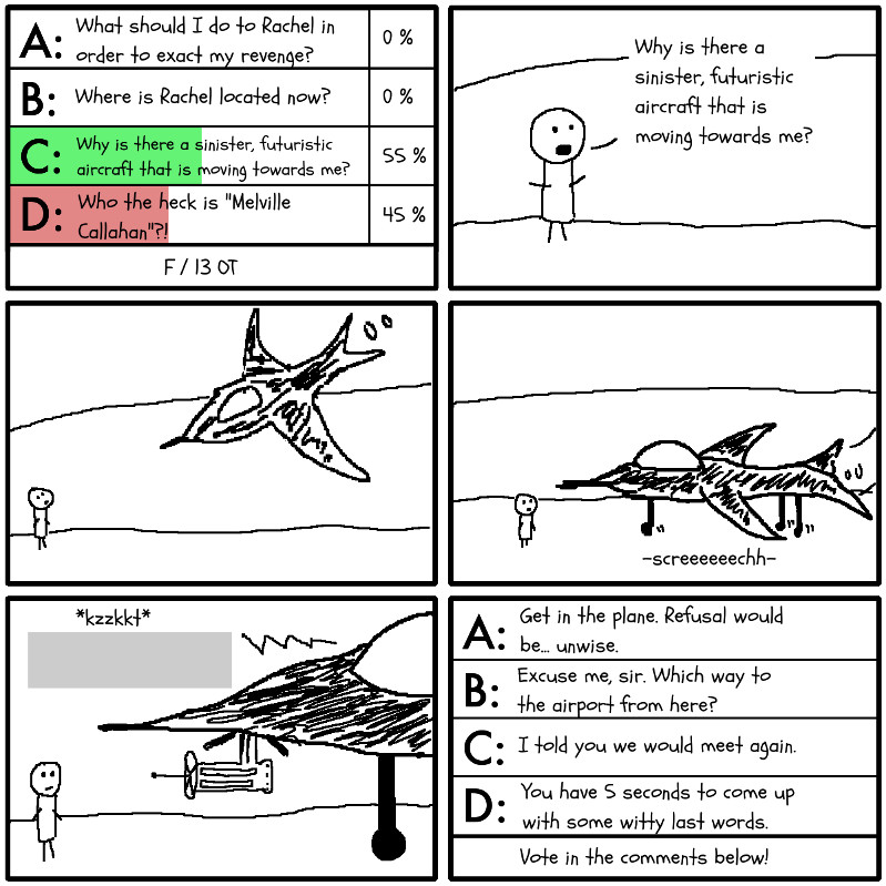 An adventure where YOU decide what happens next! At the end of each episode, there are 4 possible choices. Vote for your favorite in the comments section, and whichever one wins is what I'll draw next! So far, fans have voted for a story about Melville Callahan and his history teacher Mr. Fredenberg, on a quest for revenge – or just to stop Google from taking over the world. How will their adventure unfold from here? That's for you to decide!