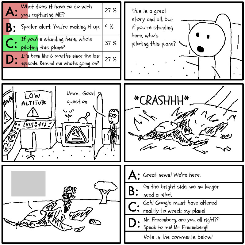 An adventure where YOU decide what happens next! At the end of each episode, there are 4 possible choices. Vote for your favorite in the comments section, and whichever one wins is what I'll draw next! So far, fans have voted for a story about Melville Callahan and his history teacher Mr. Fredenberg, on a quest for revenge – or just to stop Google from taking over the world. How will their adventure unfold from here? That's for you to decide!
