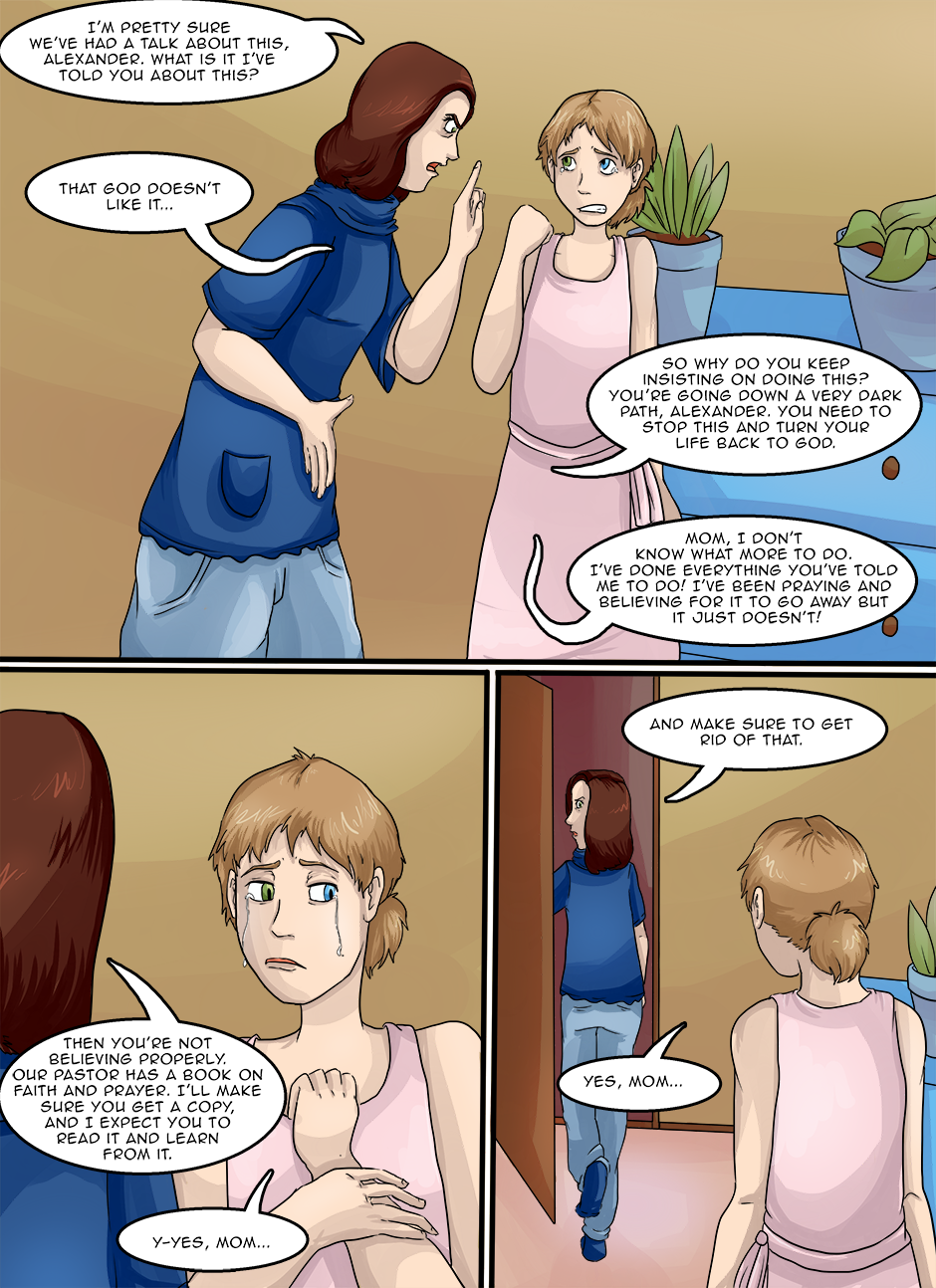 I had a hard time writing for Catherine. Part of me didn't want to write it this way because I don't want to be pointing fingers at or slamming Christians because there are some genuinely good Christians out there, and I don't want this to feel like "Christians are bad". On the other hand, I just had no other way to write this scene out...