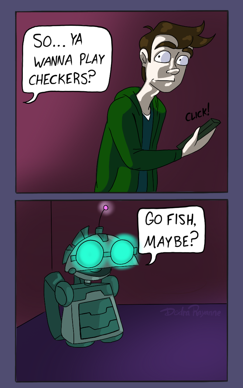 FR33K may be Tuesday’s backpack, but he has a mind of his own, and that mind gets BORED. Play checkers with the poor dude, Helix! You have two more hours.
