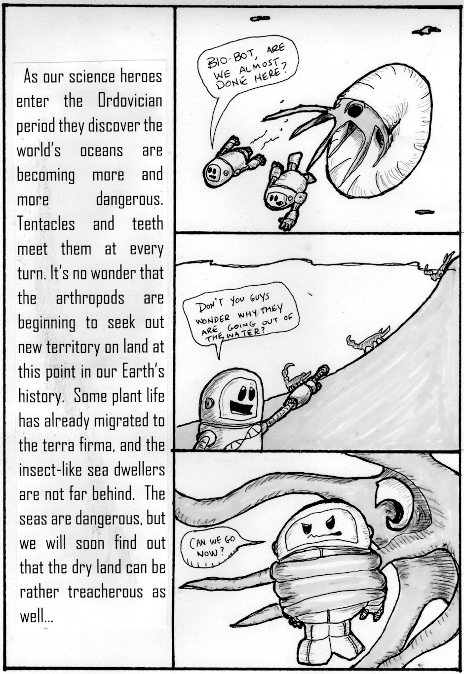 SCI-BOTS: Adventures in Science is a comic book representation of science concepts for middle school students. Physbot, Biobot, and Lithobot wander through time and space discovering things about our world and getting into all kinds of trouble along the way. Concepts of Physical Science, Life Science, and Earth Science will be learned along the way.