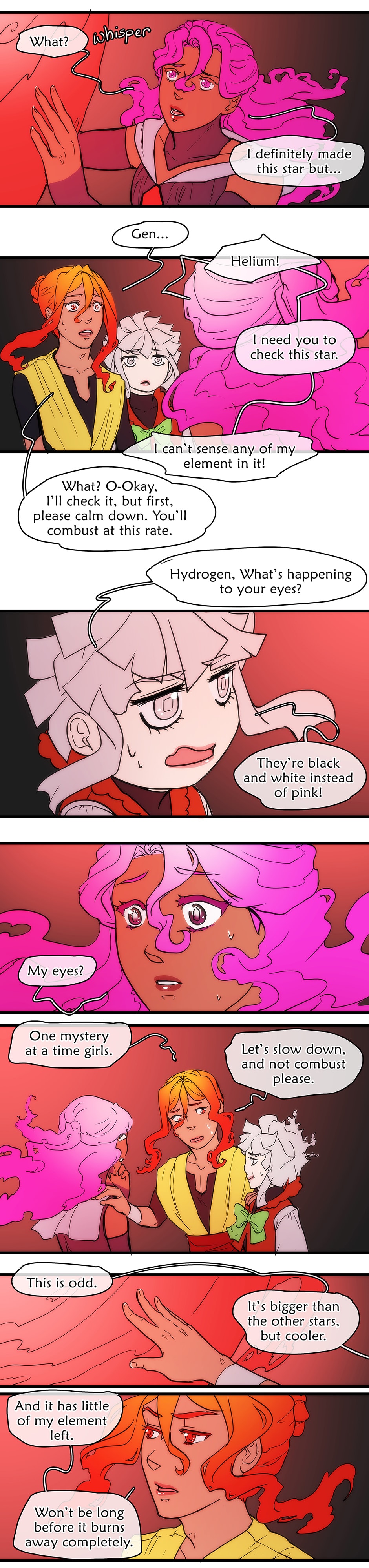 Hydrogen wakes up shortly after the Big Bang. Alone, she begins to create stars, and to her surprise, from the very first one comes Helium.