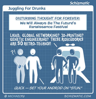 This is the upside of annihilating ourselves in planetary apocalypse: no slum tourism by douches from the future. Huzzah. Image: http://schizmatic.com/files/juggling_for_drunks.jpg Page: http://schizmatic.com/comics/19 Schizmatic: A Webcomic Of Intelligent Weirdness Store: http://schizmatic.com/store Archive: http://schizmatic.com/archive