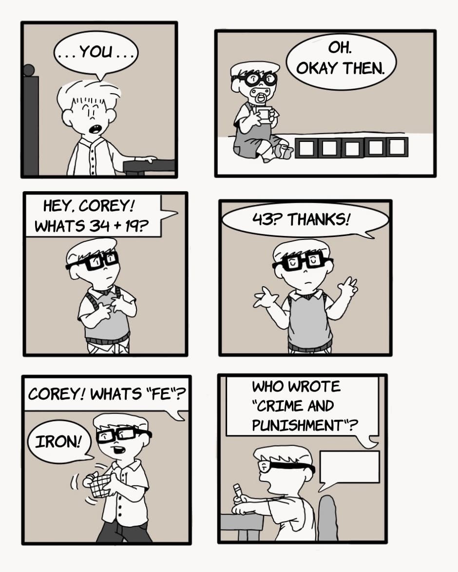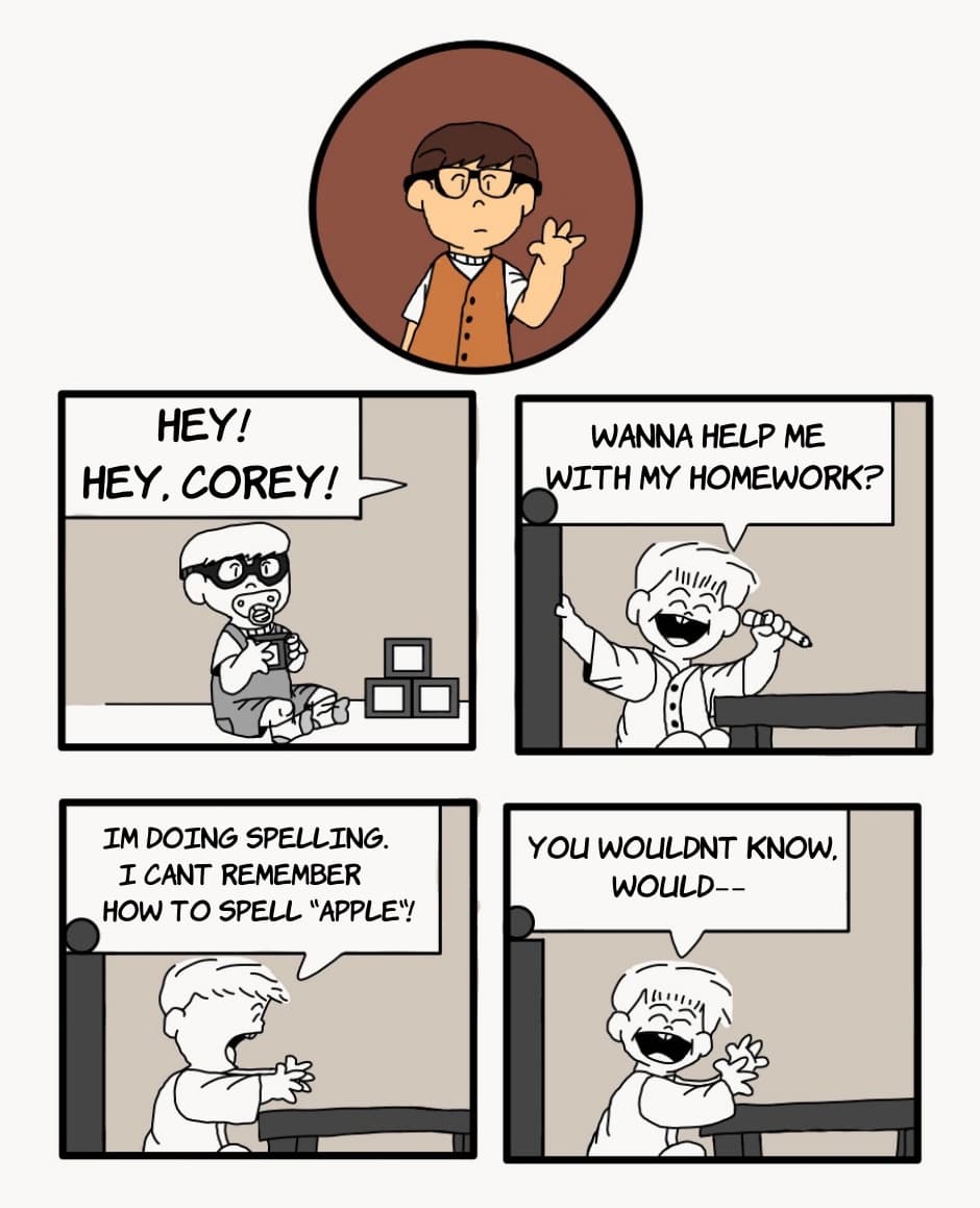 Meet Corey, the family brainiac! He has skipped two grades and usually keeps to himself. But who is the kid with the spiky hair and tank top?