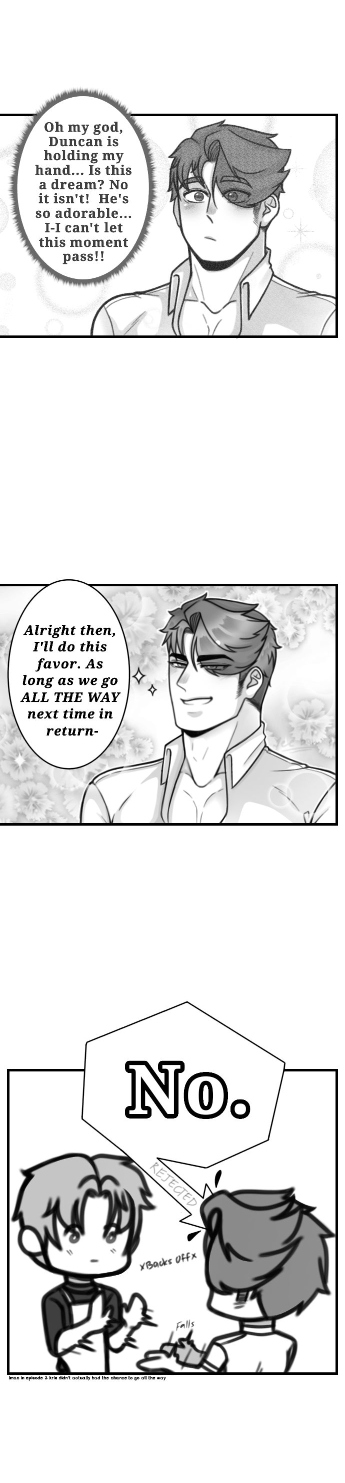 *Lemme just clear up some things since I didn't explain the story clearly. Kris spent time with Duncan at the end of episode 2, at the end of the day... Kris almost did it with Duncan but the latter refused. That's all ^^