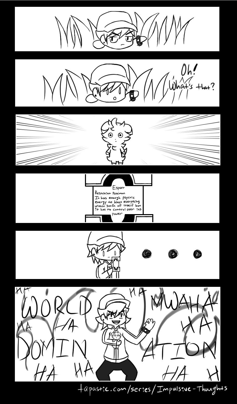Espurr, the Restraint Pokemon: It has enough psychic energy to blast everything within 300ft. of itself but it has no control over its power Espurr is also freakin adorable, as well as both of its evolutionary forms, so pluses all around XD what's your favorite pokemon?? Also sorry that the last panel looks messy, I didn't really know how else to portray my evilness XDD