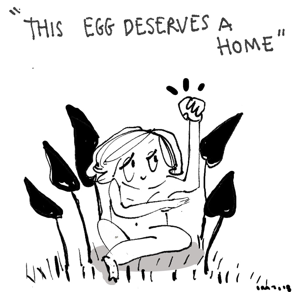 Sosteniéndo ese huevo con todo su amor.