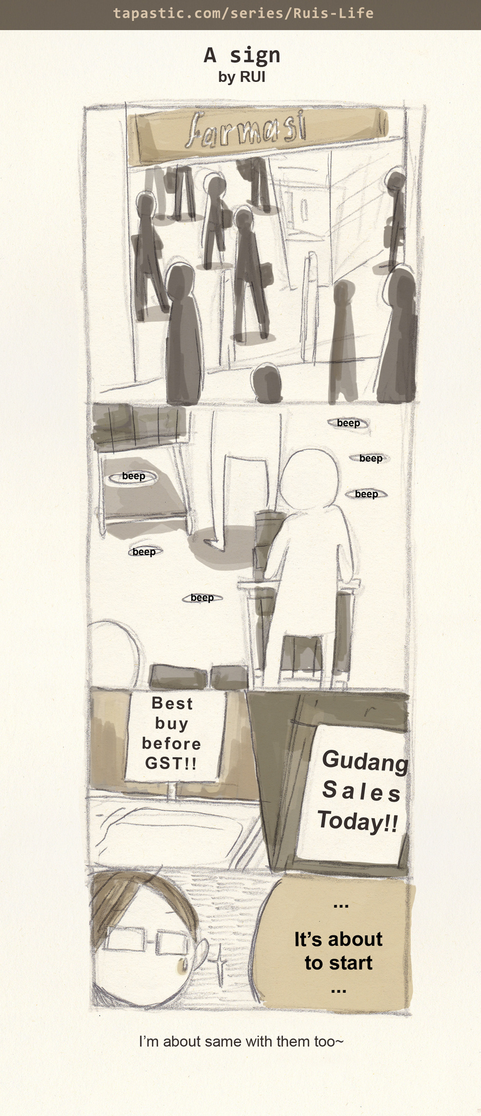 OH NO! GST is about to start at April!!! ;;A;;;;; You can see everyone is very peaceful queuing and there were so very long 'beep' sound you will hear~ (refer to the number of item in trolley is a lots!) 天!下个月就要开始GST了! ;;;A;;;; 大家都很和平安静的在排队~还有没玩没了的“beep”声~(意味着收推车的东西有很多~) tumblr: http://carmenlim-rui.tumblr.com/post/115033028105/