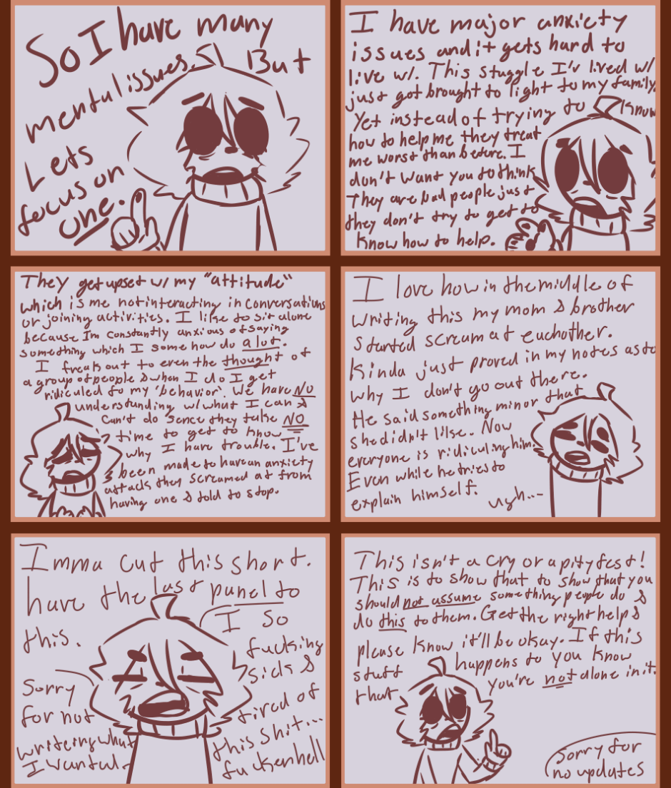 Seriously was gonna write actual shit that probably needs to be said. They always talk about their public reputations and tell us to not say anything for their sake because then they would be 'embarrassed' like don't be a dick if you don't want to be know as a dick. Am I wrong? They put on a public image of lovely wonderful people and feel free to be able to scream, juridical, and mentally abuse me or my brother at home. My mother likes to put words in our mouths and not listen to reasoning what so ever. It's fucking stupid and annoying. This was gonna be a help for people with anxiety, but it has not turned into 'fuck this family I'm so done with it.'