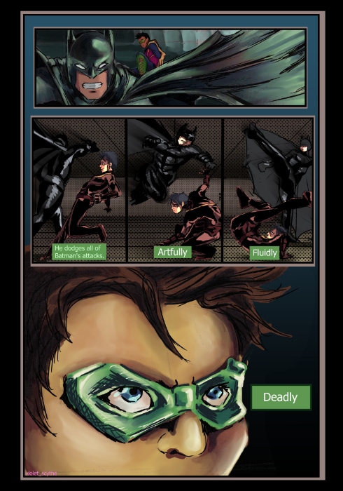 In an alternate universe, Dick Grayson was taken was taken from Haley's Circus by Slade Wilson and raised to be the infamous Renegade, and Damian is making his way as the third Robin.