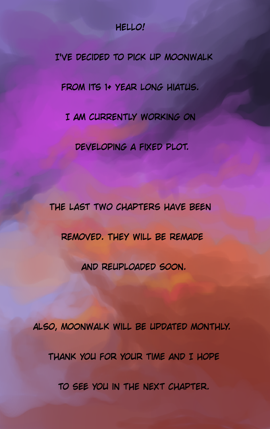 Hello! I've decided to pick up MoonWalk from its 1+ year long hiatus. I am currently working on developing a fixed plot. The last two chapters have been removed. They will be remade and reuploaded soon. Also, MoonWalk will be updated monthly. Thank you for your time and I hope to see you in the next chapter. :)