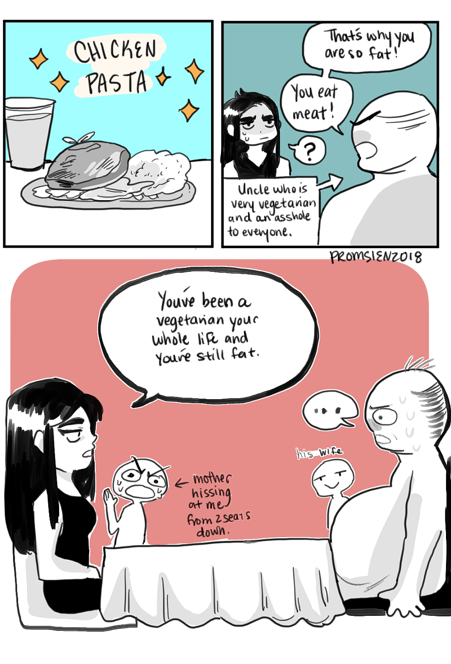 I killed a man in olive garden that day. Majority of my family and extended family is vegetarian but me and my brother love chicken! I get called out on my meat eating habits a lot but I don't take criticism on it anymore :^) Chicken is yummy!
