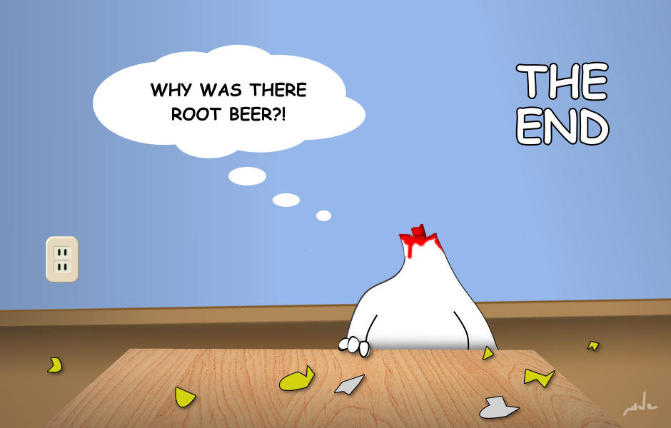 Wow, his beak really shattered. Kind of expected it to be blown clean off and bounce off the wall and end up lying on the floor in the background. What was the root beer for?