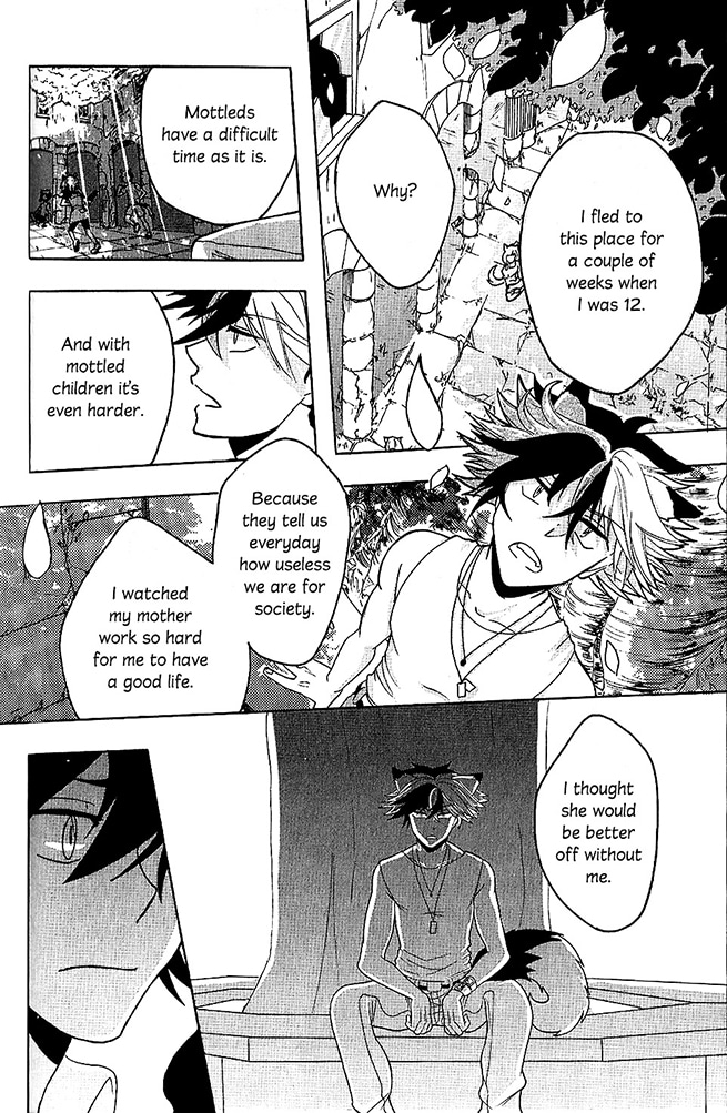 Amongst Cat People, those who have three or more fur colors are considered to be of the lowest social class. One day, when the phone of a so-called “mottled” named Alik - with precarious pictures, falls into pureblood Tavis’ hands, his curiosity is piqued. He plunges into Alik’s world which is a lot more exciting and colorful than anything he’s ever known before.