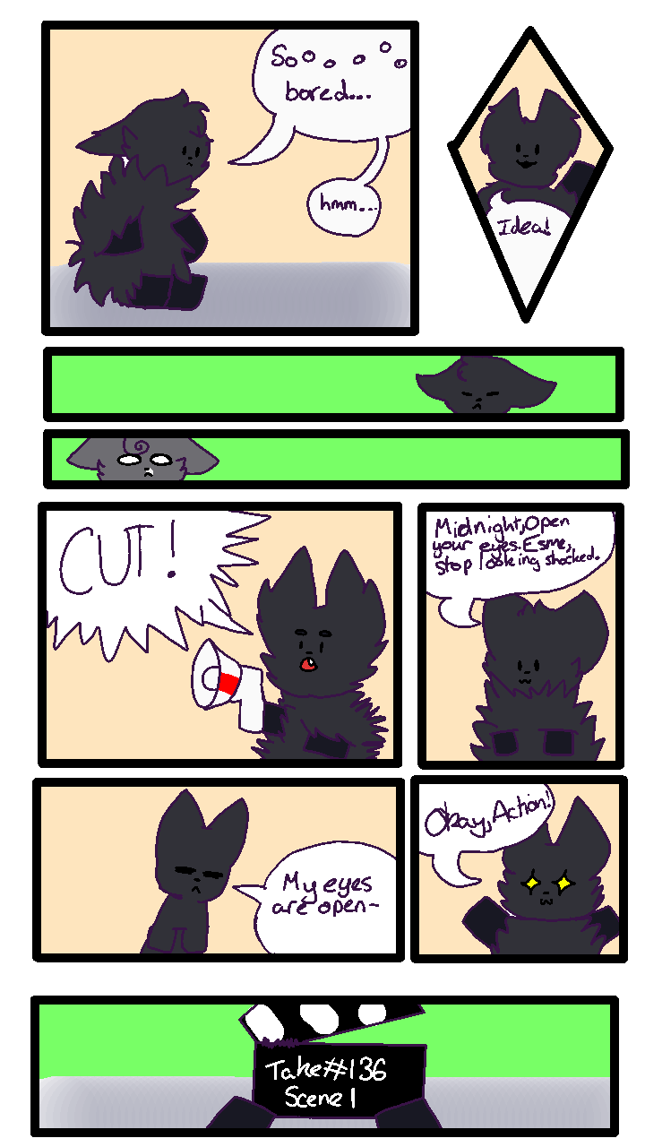 Hello! Sorry For the late upload. The story's a bit rushed too. If you're wondering what it says in that big speech bubble, I'll put it here. "Midnight, open your eyes. Esme, stop looking shocked." My handwriting sucks :/