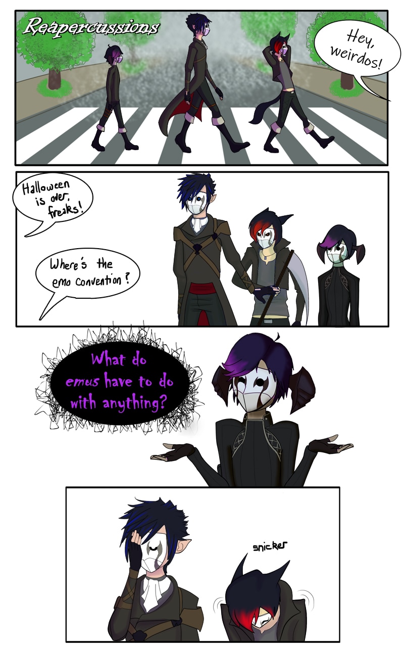 Reapercussions is a miniseries about the mishaps, shenanigans, and oddities of 3 roommate Grimm Reapers. With a total of 4, each represents a Horseman of the Apocalypse, and all of them will be introduced over time. Loosely inspired by characters I created and play on Final Fantasy XIV, you can see them in action as I dungeon away any spare time I may have.