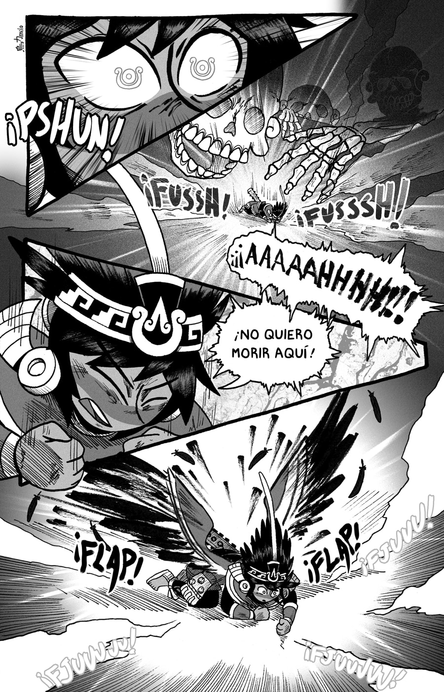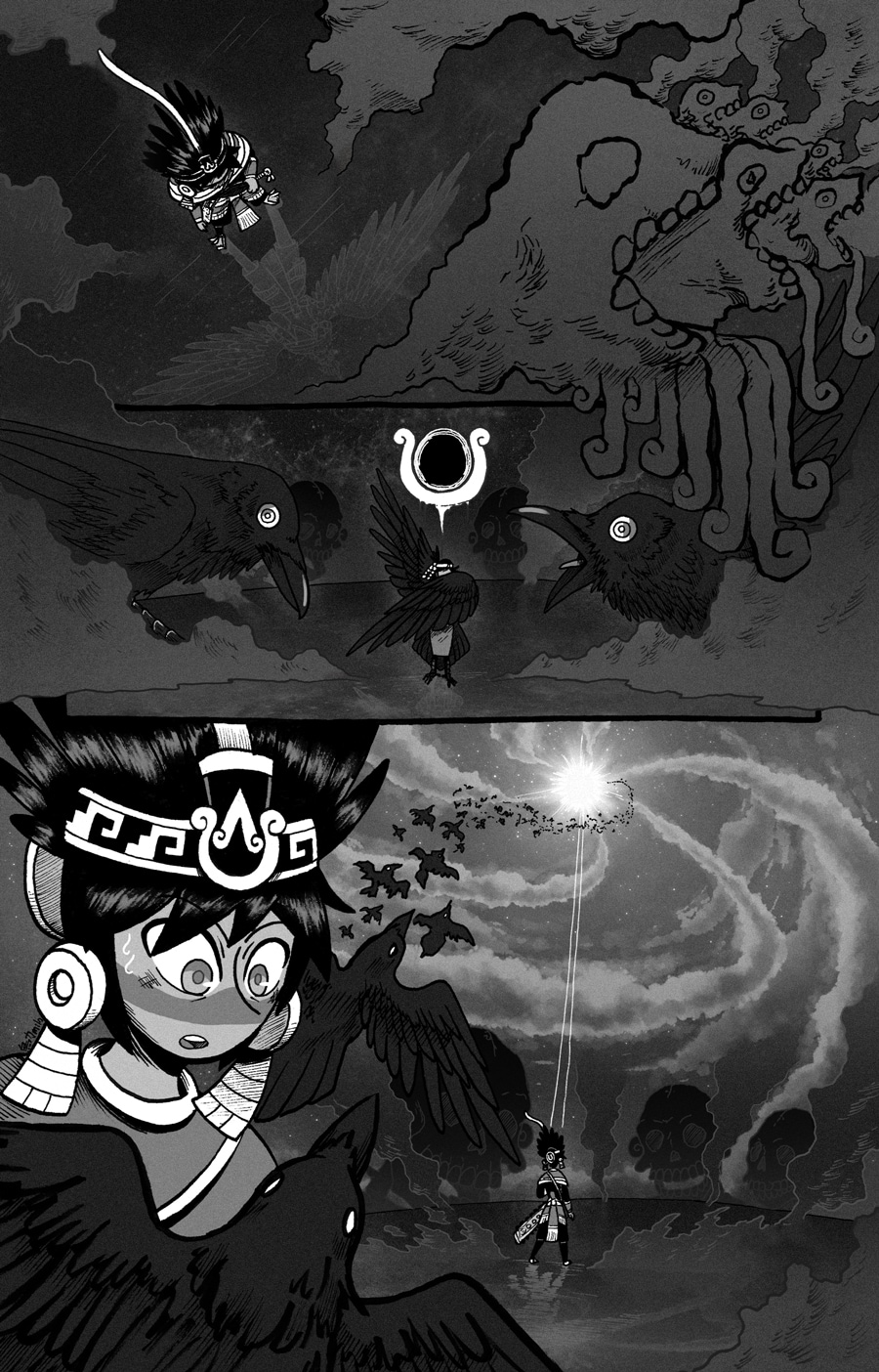 Este fragmento del cómic es en realidad una adaptación de mi animación "Black Feathers", donde se originó el personaje de Itzcacalotl.
