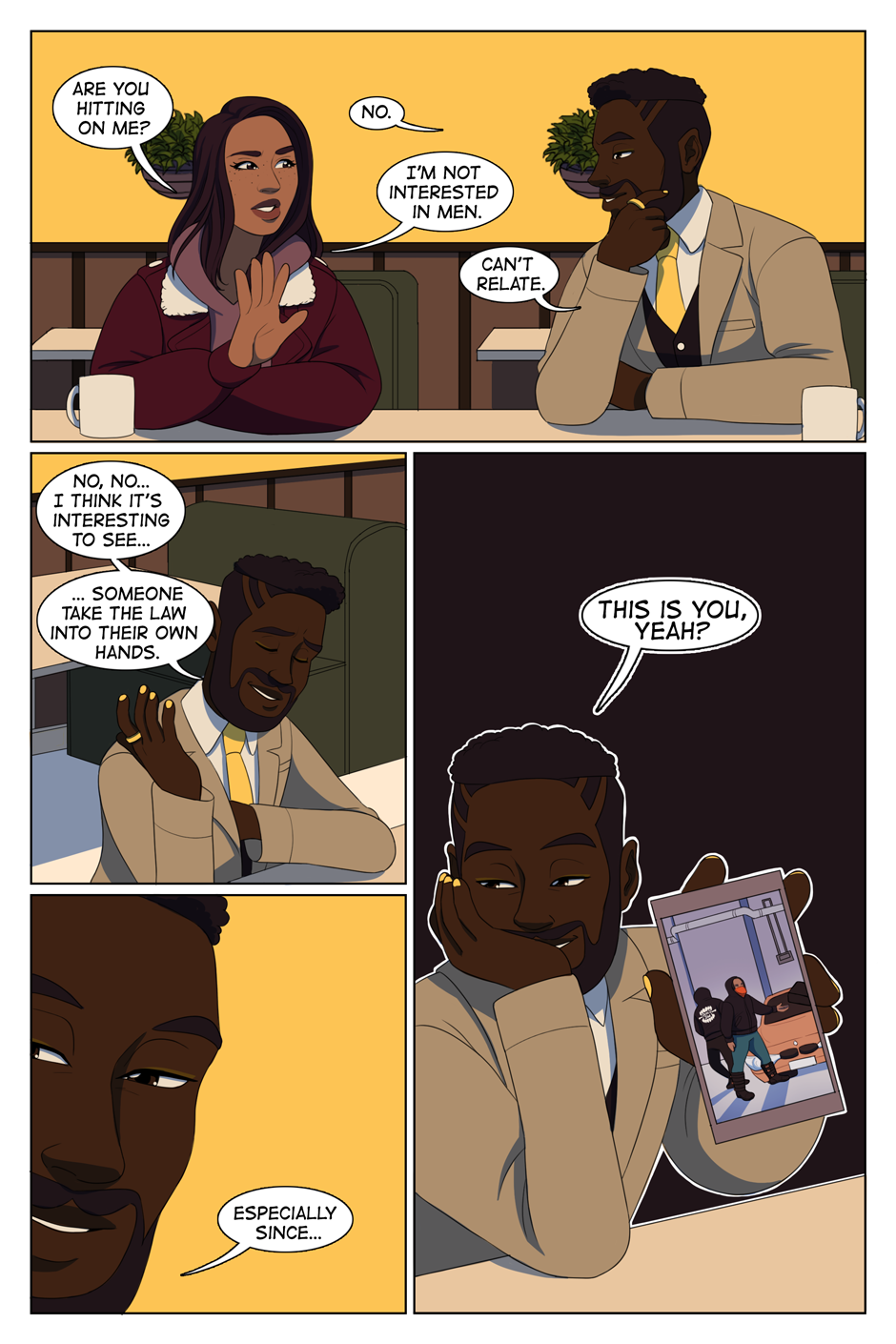 Some more pleasantries and the beginning of some action. Er, verbal action. No one's getting punched in the face this time around. Page 05. Check Patreon for extra updates or to pledge and get the next page early.