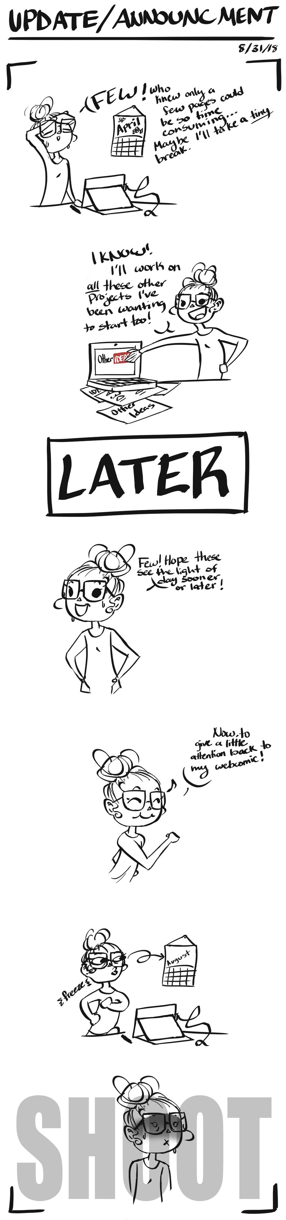 Yea, the comic is pretty self-explanatory... got caught up in other projects over the last few months. All are still ideas in progress and nothing super concrete yet but sooner or later they'll come to light... hopefully.