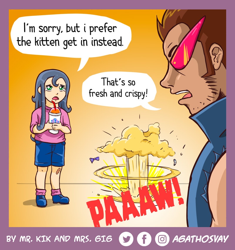 Hello there! This is the second version of the strip. We believe the drawing and joke in general were improved. Remember, we are uploading new chapters every week!