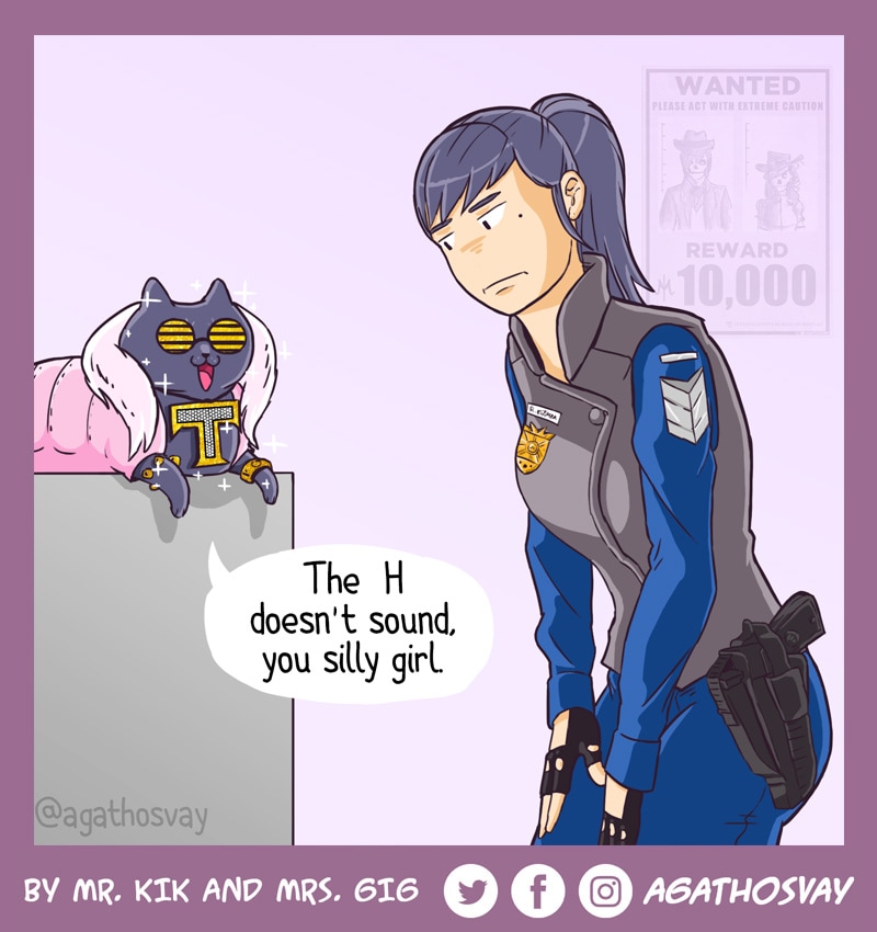 Hello again. There is an importan issue about the "H". In spanish, the H doesn't sound at all, we pronounce it as J or G only in foreign words. It's weird, but this joke was intended to our spanish public.