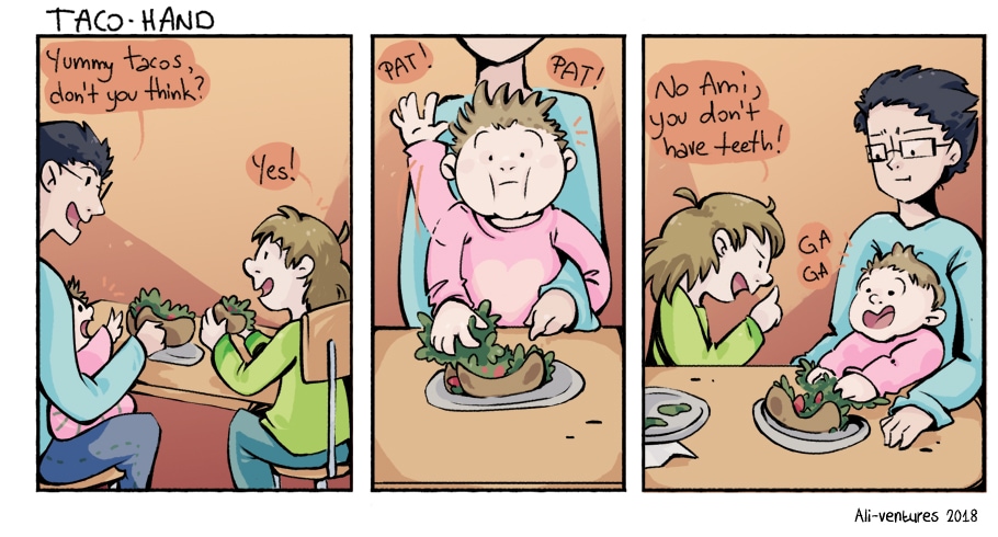 Awh so thats ur new bby? Adorable xD. Good big sister too making sure she doesnt eat what shes not supposed to. I discovered my youngest( who turns 2 tomorrow) doesnt like the taco shells. So he always gets taco stuff on a plate. I used to only dread clean up on spaghetti night but not anymore xD