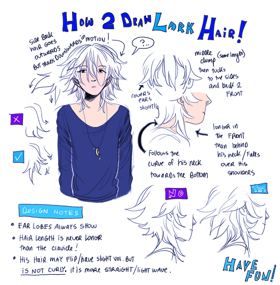 my friends would always comment on how hard ...his hair is to draw and thEY WERENT WRONG i've just gotten used to how insane my process is ....h-haha ----but if you ever want to take up the challenge this is your guide!!! (NOTE there r two versions of lark http://tapastic.com/episode/87243 but the hair is always the same design aside from color!)