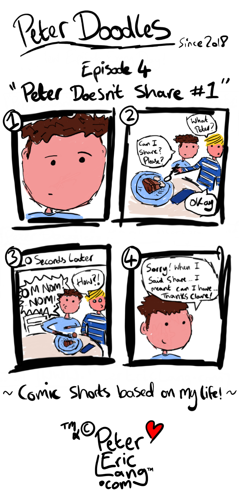 Follow Peter through a series of comic Doodles based on his life! From his hilarious comical adventures with his girlfriend Georgia to the funny things that go on in life with his family, cats, rabbit and even his extended family like aunties, uncles and his Grandad! You'll be sure to relate to topics such as nuisance phone calls, the bizarre behaviour of pets, an inability to share food, haircut disasters and so much more! Come and follow this cute adventure! It's going to be fun!!